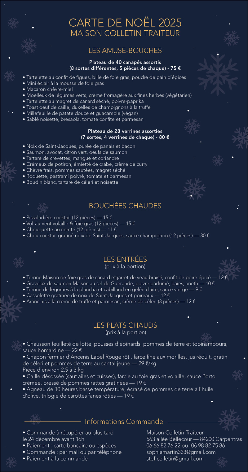 Pour le repas de Noël à récupérer au plus tard le 24 décembre à 16h
